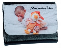 dimension 13,5cm/10,5cm avec 5 compartiments de cartes , 1 pour billet ,avec porte-monnaie ,rabat imprimable avec votre photo préférée ,fermeture magnetique.